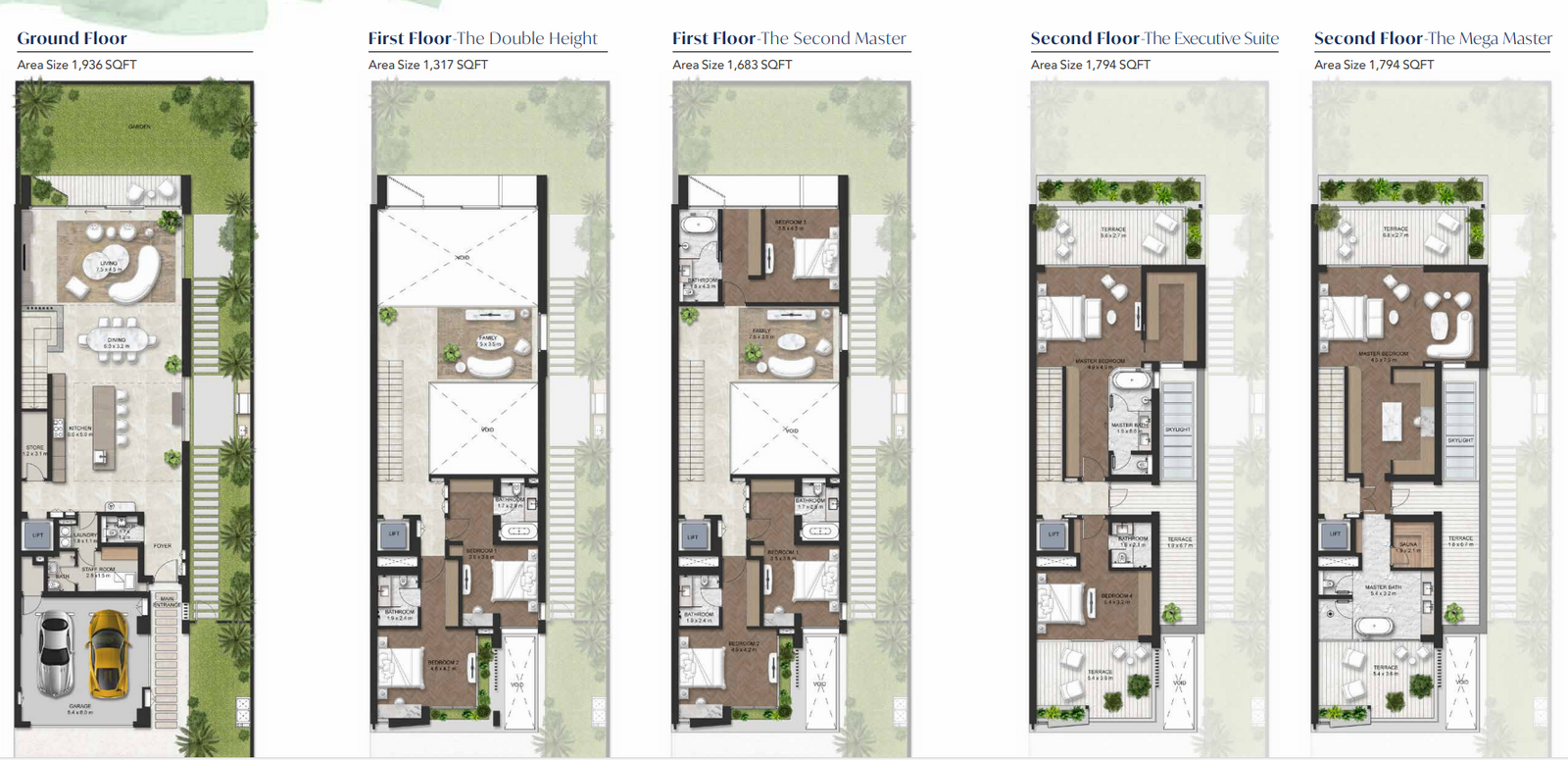 Amara is an elite residential complex in the family-oriented community of Tilal Al Ghaf, which is well-known for its generous landscaped areas and its beautiful homes that come in many sizes and configurations. The developer of the entire project is Majid Al Futtaim, and the architect of amara is the award winning Nabil Gholam. The estimated date of completion for amara is Q4 2026. Properties in this prestigious community are presented by just 116 3–5 bedroom villas that come with three levels and a private elevator, and are distinguished by their customizable floor plans. Sizes of these gorgeous villas range from 5,047 sq. ft to 5,413 sq. ft. The signature collaboration with the luxury design studio — Bergman Design House — has enabled both the developer and designer to come up with the creation of these truly unique interiors. For instance, the semi-outdoor areas in the residences seamlessly introduce greenery into the living quarters, bringing the outdoors-in.