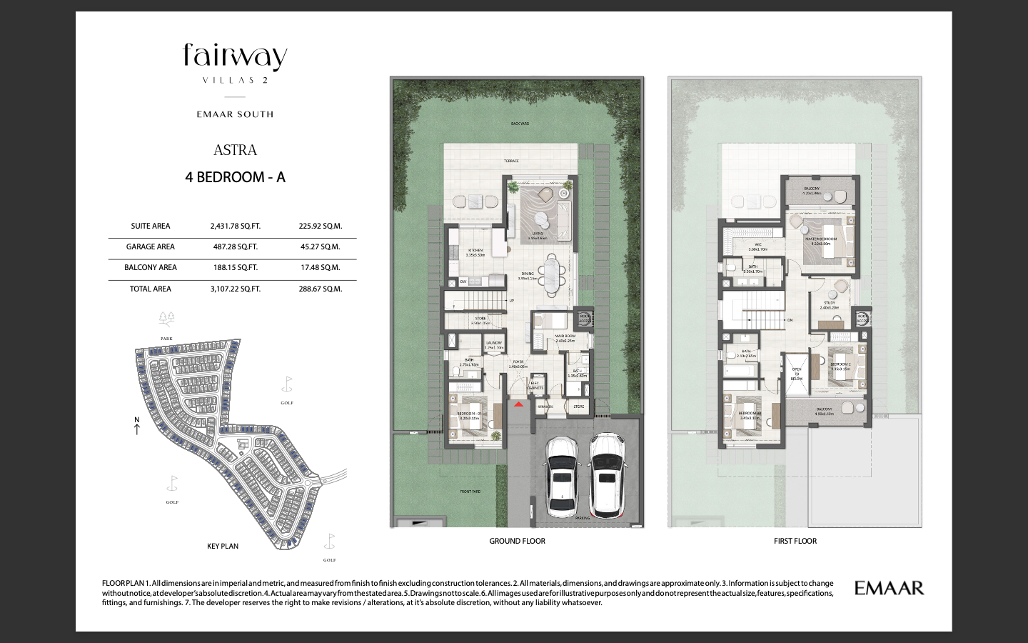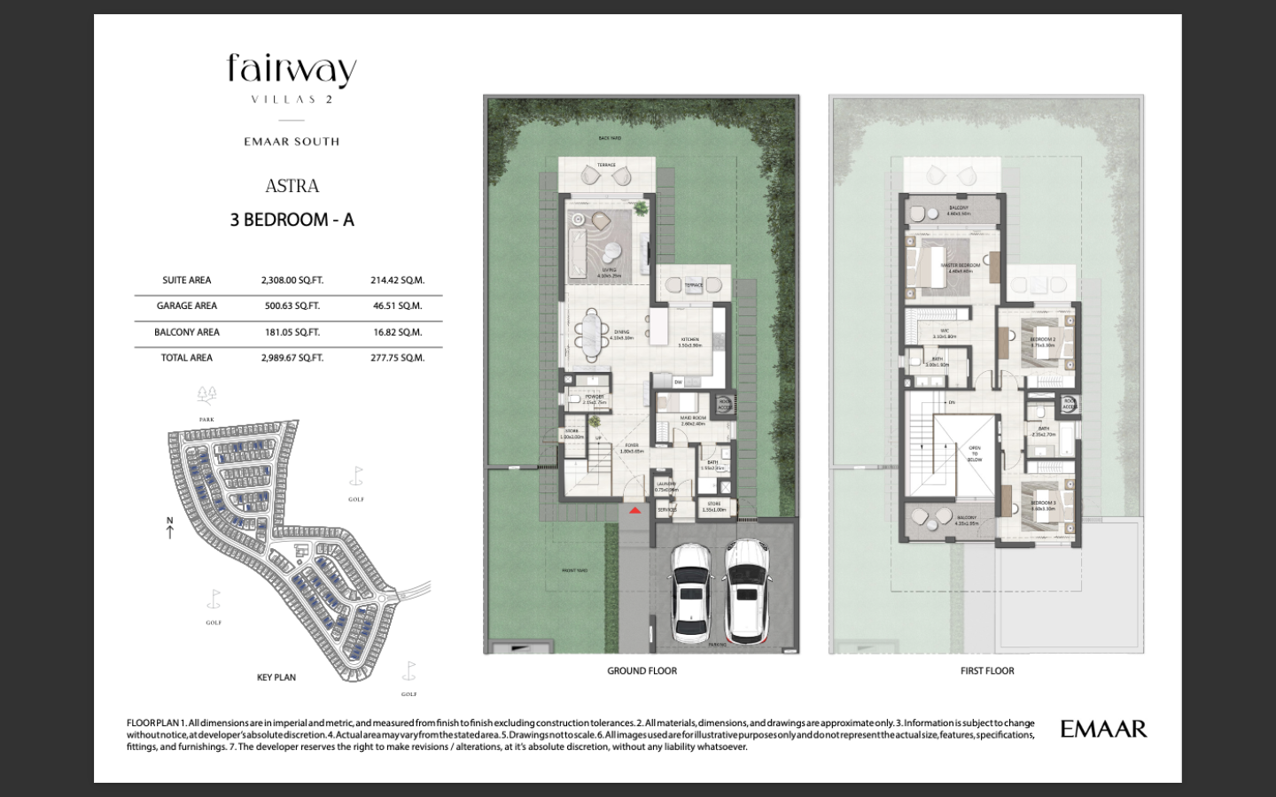 Fairway Villas is an upscale development by Emaar Properties in the thriving area of Emaar South in Dubai South. In the first phase, launched in 2022, here are only 49 three and four-bedroom villas available for acquisition, with a total living area of 2,988 sq. ft and 3,126 sq. ft respectively. The plot size of the properties ranges from 4,936 sq. ft to 10,729 sq. ft. The second phase of Fairway Villas was presented in May 2023. It has a collection of 3-4 bedroom homes in 2 styles: Astra and Nova. The size of these units is either 2,990 sq. ft or 3,107 sq. ft.