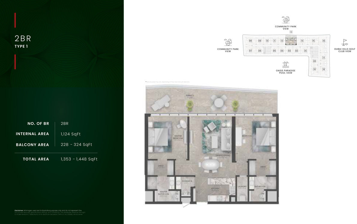 The Golf Residence will be nestled in Dubai Hills Estate. Residents of the development will benefit from easy access to Al Khail Road that will get them to key areas of Dubai within a short, couple minute’s drive. Travel time to Downtown Dubai, Business Bay and Dubai Marina will take about 15 minutes, while Dubai International Airport will be accessible within 20 minutes by car. The project will attract foreigners with children thanks to a great number of educational institutions in the surrounding neighbourhoods. Thus, within a 5–10 minute drive you will reach Blossom Dubai Hills Nursery, GEMS New Millennium School, GEMS Wellington Academy, GEMS International School and Repton School Al Barsha. Occupants of The Golf Residence will be able to get professional medical help at King’s College Hospital London, Aster Clinic — Aswaaq Mall and Dulsco Medical Clinic.