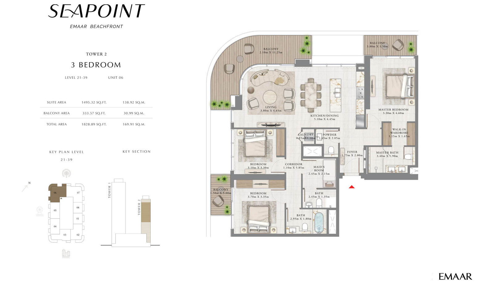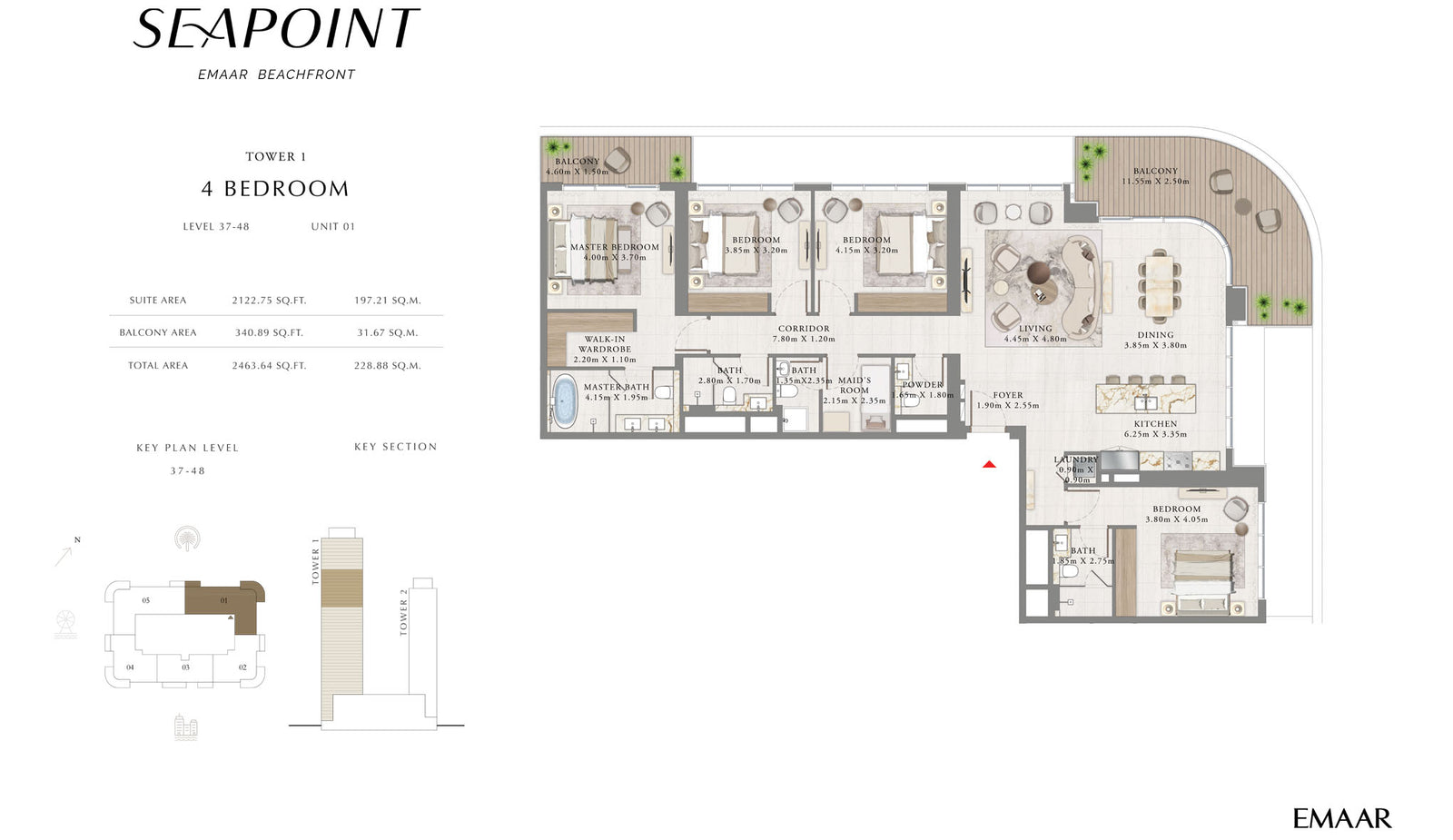 Residents will enjoy a premium lifestyle with plenty of amenities. One of the main features of the complex is the largest swimming pool within Emaar Beachfront, which is located on the common podium.The seaside development of Seapoint is strategically located in Emaar Beachfront in Dubai Harbour, which is a vibrant Miami-style community with ultra-luxurious residential projects and a range of famous attractions. The waterfront residential project by Emaar Properties is situated close to one of the main highways of the emirate – the Sheikh Zayed Road, which provides easy connectivity to other parts of the city.