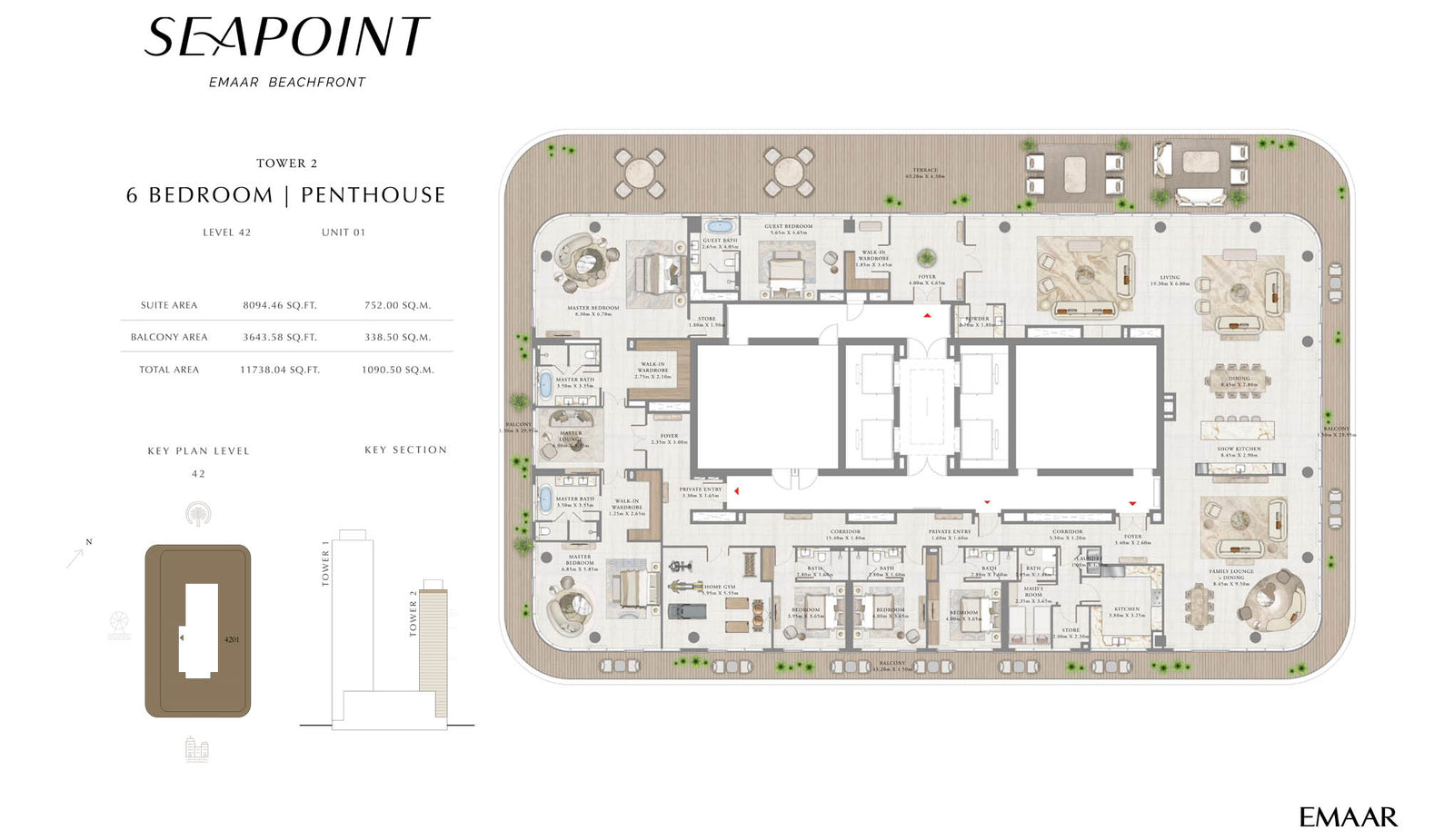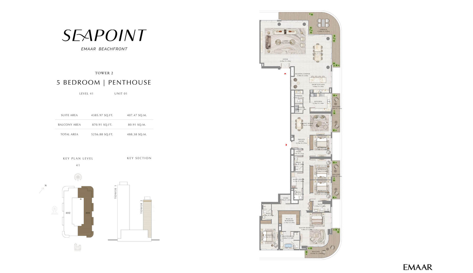 Seapoint at Emaar Beachfront is a seaside residential complex The residential development includes Tower 1 with 57 storeys and Tower 2 with 42 floors. Real estate in the complex is presented by apartments with 1–3 bedrooms, as well as penthouses with 5-6 bedrooms. The layout of 3-bedroom apartments in the residential complex of Emaar Beachfront Seapoint includes a maid’s room with en-suite bathroom. The exclusive penthouses in the project feature a family room, a reading corner, a show kitchen, master lounge and even a home gym in 6-bedroom units. Homes will be distinguished by the stone flooring. All waterfront residences will feature breathtaking views of the sea, the Dubai Harbour Boulevard, Ain Dubai, Dubai Marina and Palm Jumeirah.