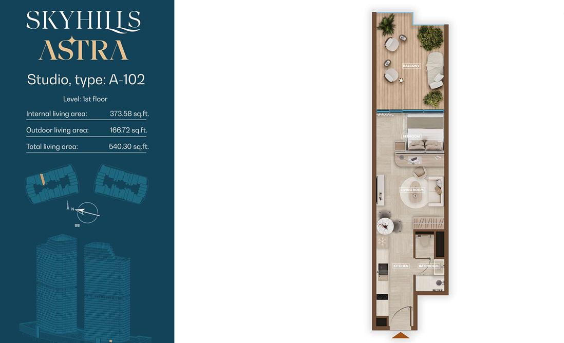 SkyHills ASTRA is a luxury residential development featuring two symmetrical towers in a prime Dubai location. Just a minute from the metro and opposite Dubai Hills, it offers seamless connectivity and urban convenience.