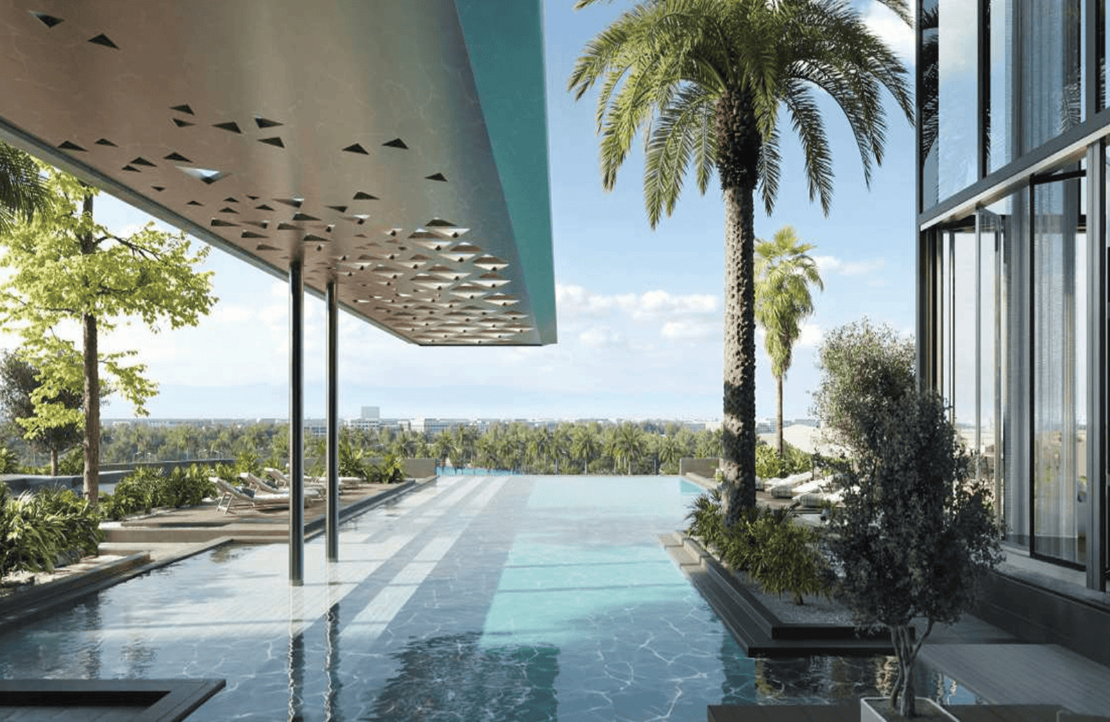 The exclusive class amenities have been designed to support a balanced lifestyle that promotes wellness, relaxation and community living at ease. Starting from the ground floor, step into the grand lobby and entrance area, where guests are welcomed into a modern retail arcade. The fourth and fifth floor provides residents with spaces for relaxation, entertainment and social interaction. Enjoy and unwind in the cinema room or media room, or take in the stunning views from the pool deck and outdoor lounge. Fitness lovers can have state of the art fitness studios and yoga spaces, while kids can enjoy the dedicated kids play area. The major highlight of the façade is the stunning Infinity-edge pool, complete with a Baja Shelf for lounging and pool pavilion for relaxing. For more enjoyment, residents can explore the sky gardens located on the 34th and 35th floor, offering stunning views of the surrounding skylines and lagoons. The sky dining lounge and fire pit offers unique spaces for social gathering, while the observation deck provides unparalleled views of Dubai Skylines.