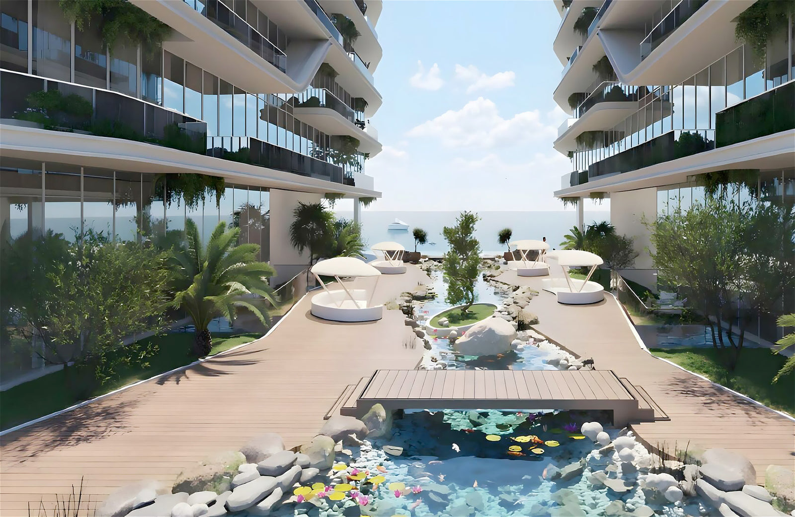 Properties are presented by branded 1 and 3-bedroom apartments, 4-bedroom penthouses and 3–4 bedroom duplexes. Residences are distinguished by luxurious interiors with automated Smart Home systems and unobstructed sea views. A contemporary architectural style in the complex is reflected through open floor plans and large windows in units. Treppan Living offers its residents a waterfront living with access to premium amenities. They are presented by an infinity swimming pool, sunken cabanas, aqua gym, BBQ zones and rooftop sun deck with jacuzzi. There is Koi Pond within the complex’s territory. Treppan Living is suited to the living of families with children, as a children’s playground and swimming pool for kids are available here. You can spend time with your friends in a pleasant atmosphere in Green House Cafe.