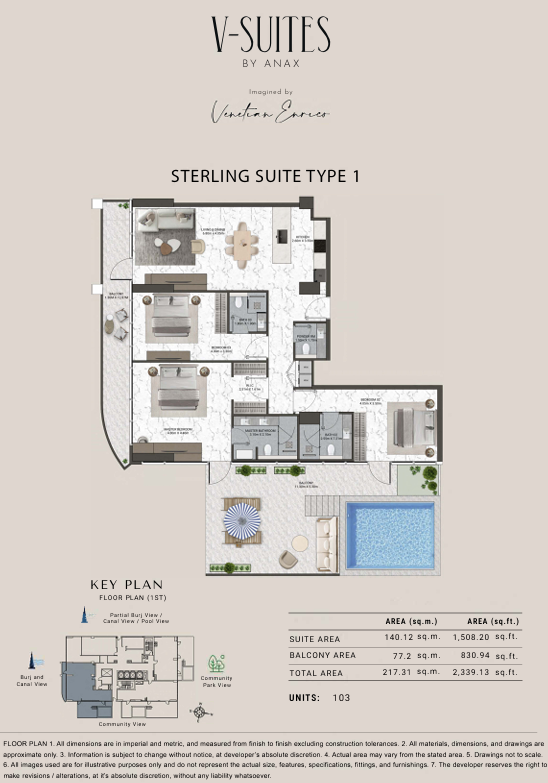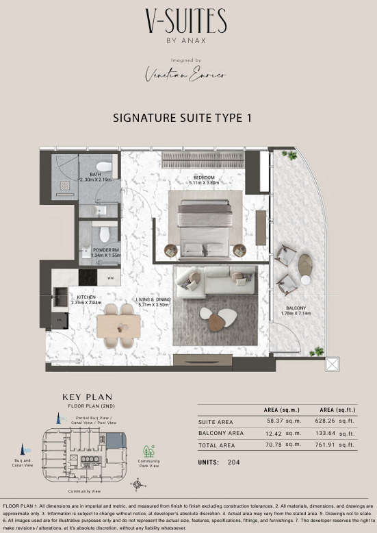Rising gracefully along the shimmering Dubai Canal, V-Suites is a statement of architectural brilliance and refined living. The tower features 225 residences across 19 floors, each meticulously furnished with custom Italian designs, floor-to-ceiling windows, and elegant finishes. From its grand Venetian-inspired lobby to the seamless indoor-outdoor living experience, every detail has been curated to create an atmosphere of cultural intelligence and elevated comfort.