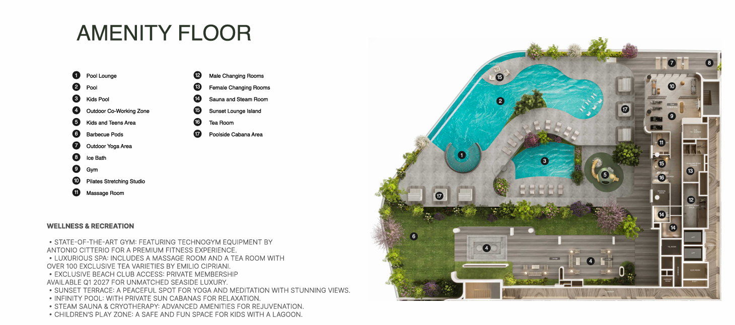 Villa Del DIVOS is designed to push the boundaries of architectural excellence. Every apartment within the building is crafted with meticulous attention to detail, featuring high-end materials and modern, sleek interiors. With expansive floor to ceiling windows, residents enjoy unobstructed views of the Arabian Gulf, while the open-concept layouts are perfect for entertaining or simply relaxing in style. Apartments are fitted with top-of-the-line finishes, including private balconies with unparalleled water views, luxury kitchens with cutting-edge appliances, spacious living areas flooded with natural light, elegant bedrooms with ensuite bathrooms, and premium flooring and finishes throughout. Living at Villa Del DIVOS means more than just owning a home; it’s about embracing a lifestyle of luxury and exclusivity. Residents enjoy access to a host of premium amenities, including infinity pools overlooking the coastline, state-of-the-art fitness centers equipped with the latest technology, a private clubhouse for residents to socialize, relax, or entertain guests, and 24/7 concierge and security services ensuring privacy and peace of mind