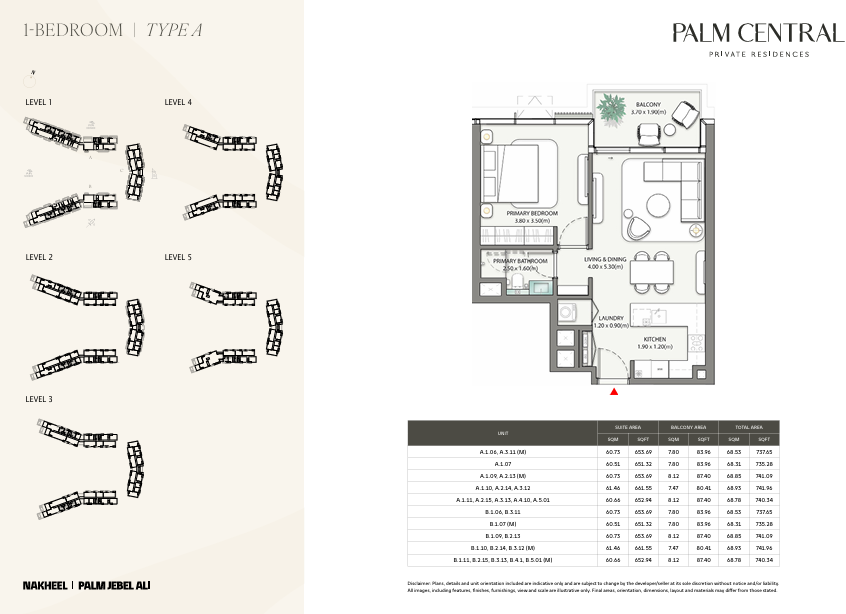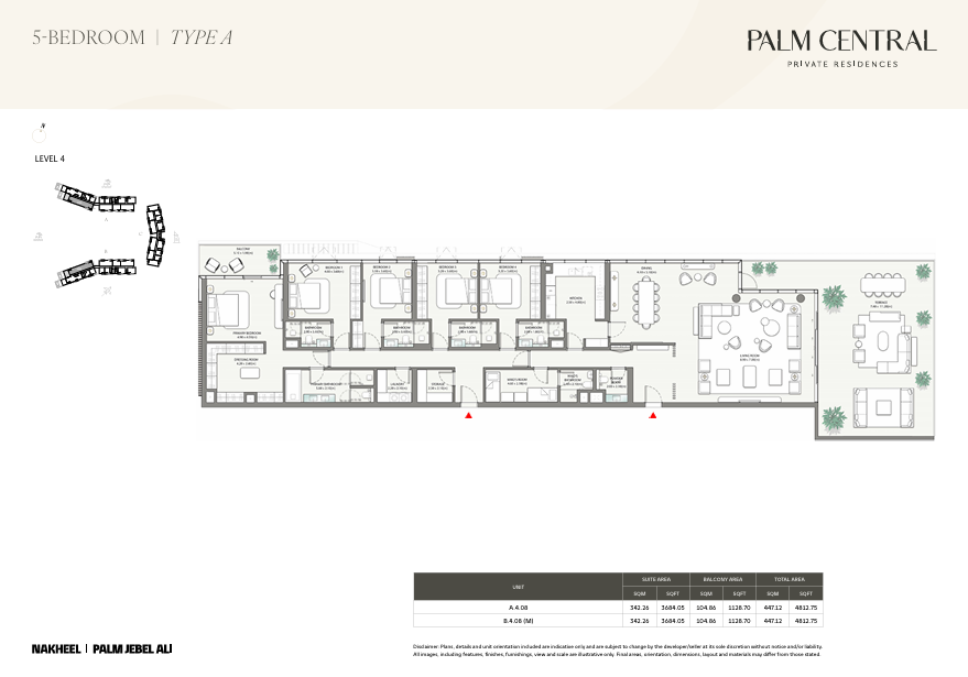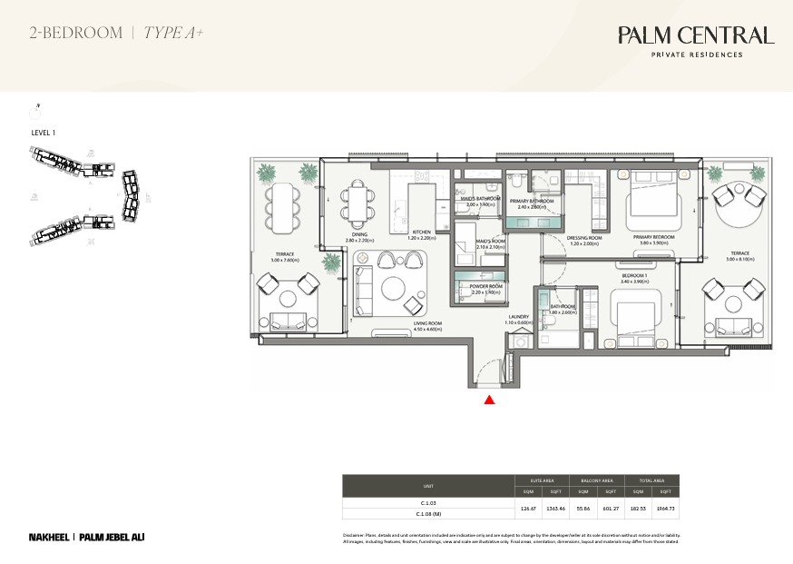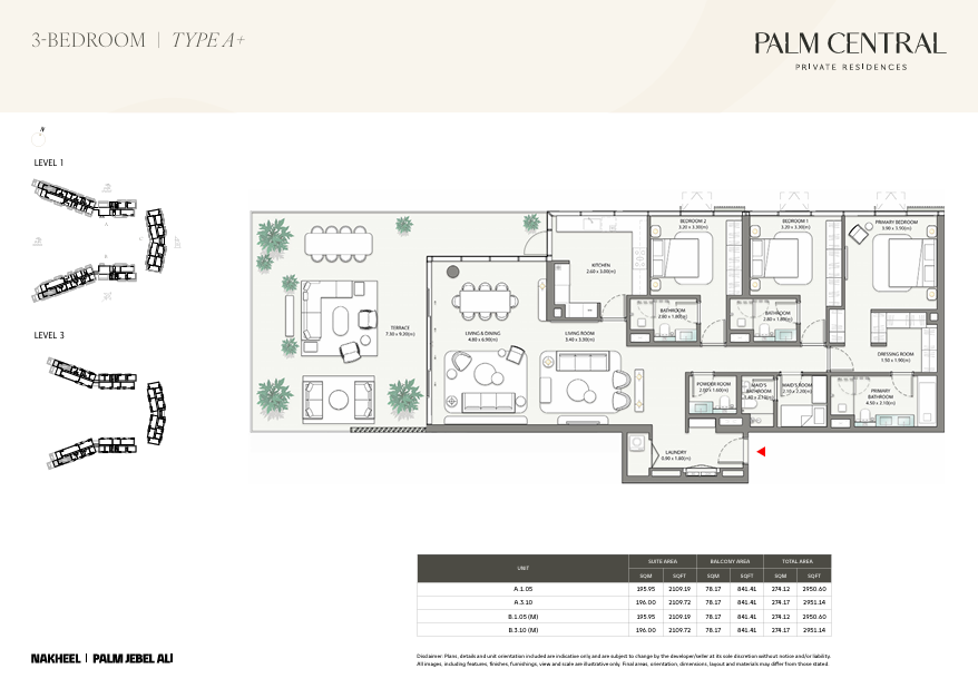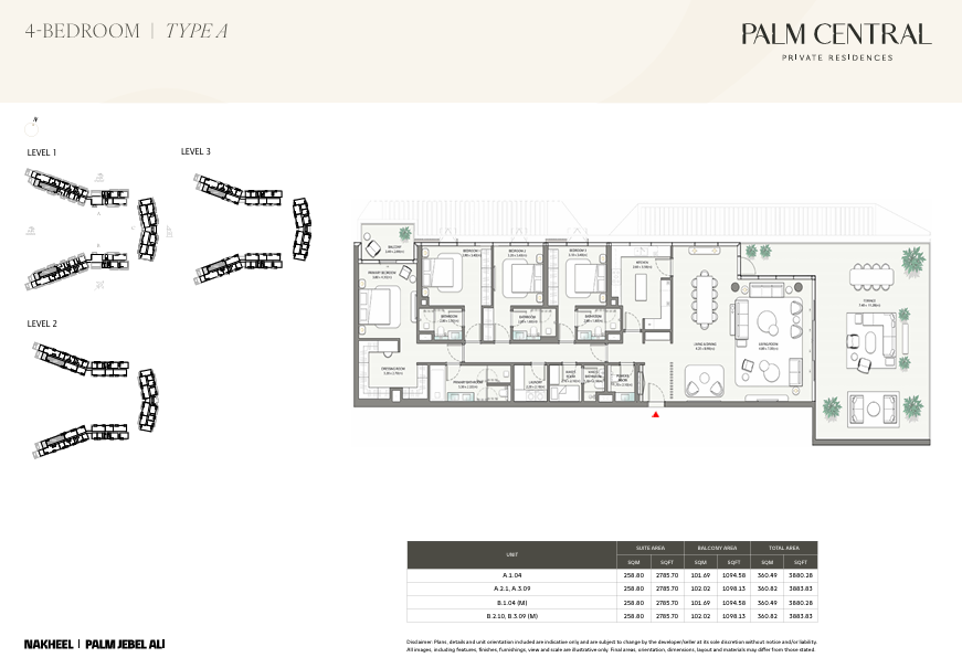 Comprising 212 contemporary homes across three elegant buildings, Palm Central is designed with a distinctive stepped architecture that opens each residence to uninterrupted sea views. The design harmonizes architecture and nature, creating a seamless connection between landscaped gardens, private beaches, and light-filled interiors. From stylish apartments to grand penthouses and townhouses, every home features refined craftsmanship, open layouts, and an atmosphere of understated luxury that reflects the prestige of coastal living.