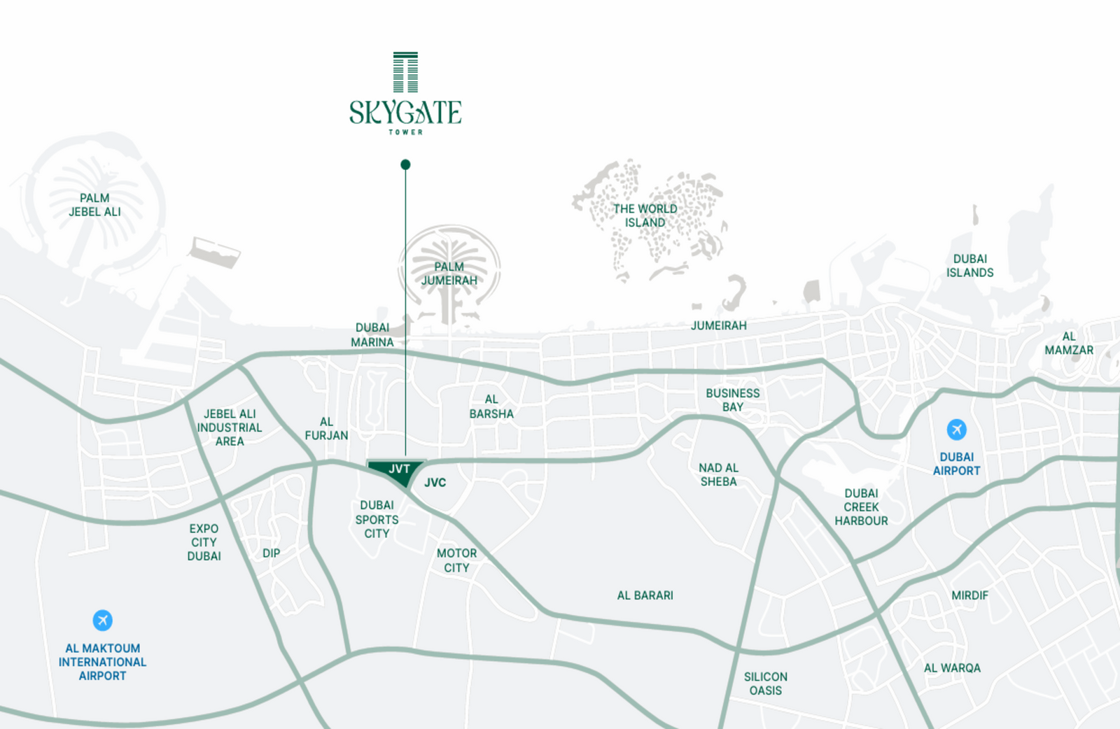 Sky Gate Tower offers residents a curated selection of world-class amenities, including a temperature-controlled swimming pool, state-of-the-art gym, wellness and yoga spaces, children’s play areas, landscaped gardens, and elegant lounges for social gatherings. The tower’s prime location in JVT ensures seamless connectivity to major highways such as Sheikh Mohammed Bin Zayed Road and Al Khail Road, providing easy access to Dubai Marina, JBR, Mall of the Emirates, and Downtown Dubai. With schools, supermarkets, dining outlets, and the upcoming Al Khail Avenue Mall just minutes away, Sky Gate Tower delivers a lifestyle of luxury, convenience, and community in one exceptional address.