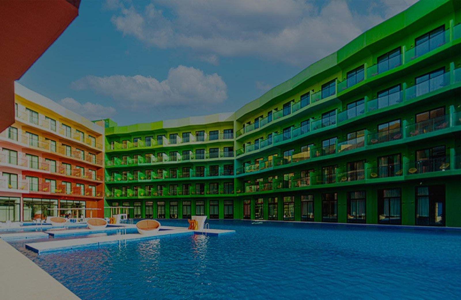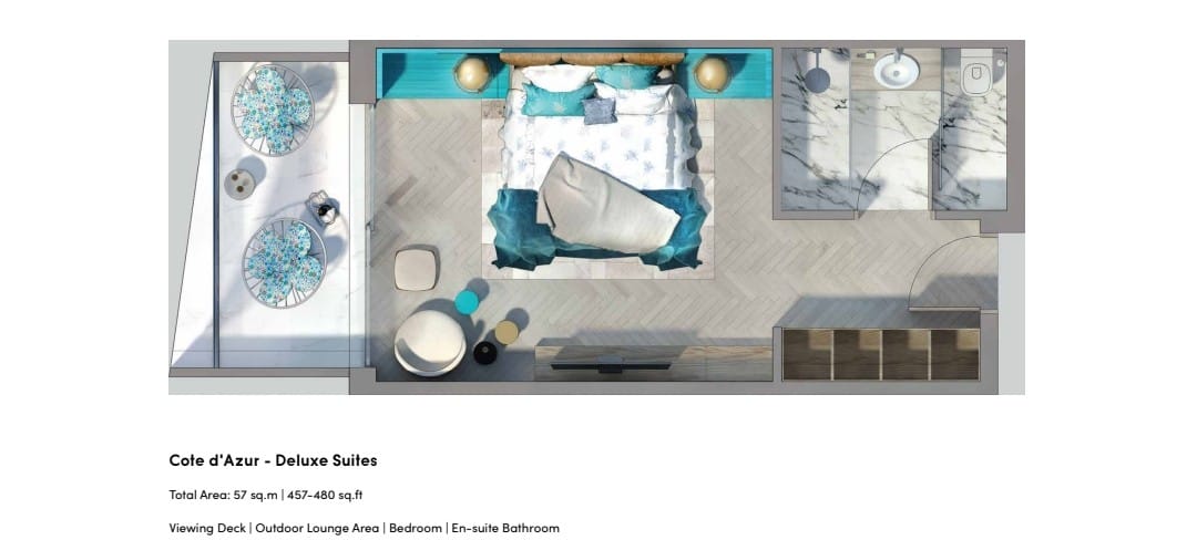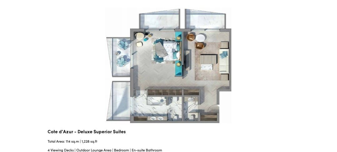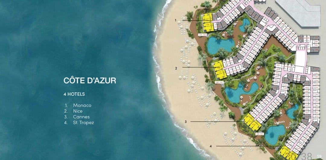 The complex consists of four hotels named after popular Côte d’Azur cities: Monaco, Nice, Cannes, and Saint-Tropez. Each boutique hotel offers around 250 hotel apartments, which come fully furnished and are equipped with modern appliances and a Jacuzzi.Interiors were designed using eco-friendly materials only. The roofs and walls of hotels are well-insulated and soundproof. Most of the residences have large windows with magnificent views of the beach and the Arabian Gulf. The complex was designed to minimise energy costs, and solar panels are being used to support this effort.